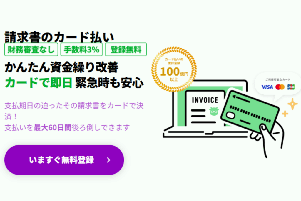請求書カード払いは買掛金の支払いを遅らせるサービスなのでアプローチが逆です。コスト面でも請求書カード払いの方が有利で、「短期的に支払いを延ばしたい」場合に向いています。