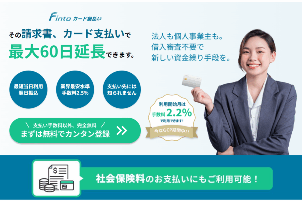 Fintoカード後払い | 2.5% | 最短翌営業日 | 最長60日 | 最安水準の手数料 |