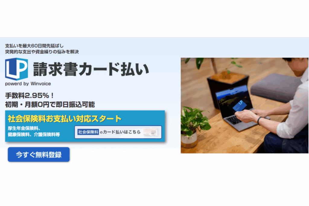 LP請求書カード払い | 2.95% | 最短即日 | 最長60日 | 即日入金に対応 |