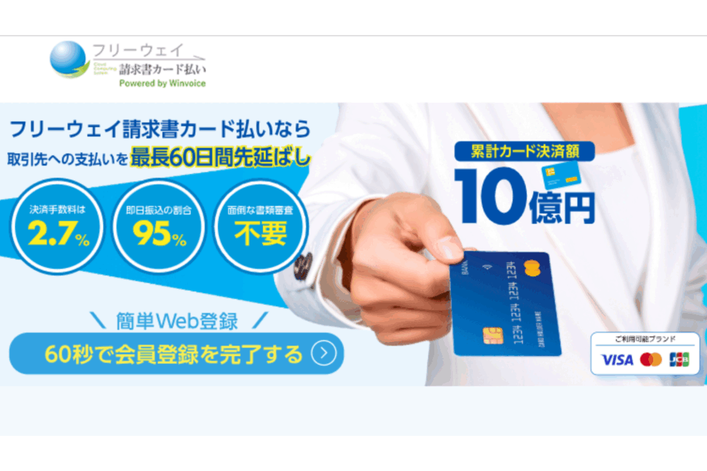 フリーウェイ請求書カード払い | 2.7%(非課税) | 最短即日〜3営業日 | 最長60日 | 非課税かつ低率 |